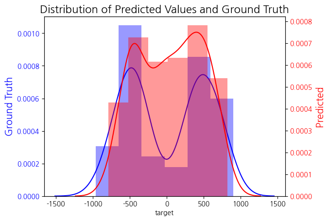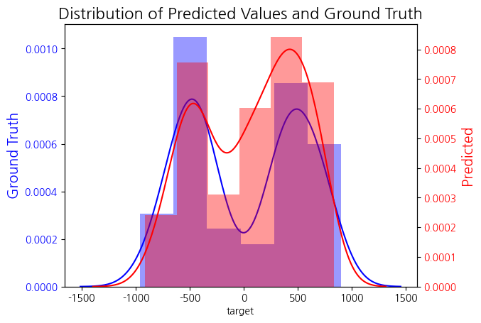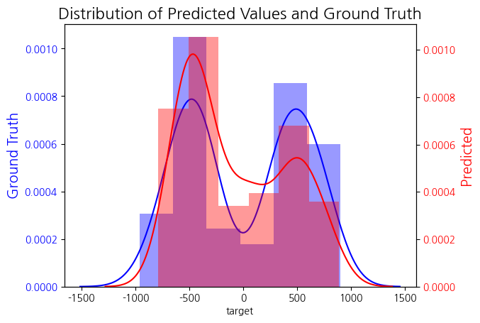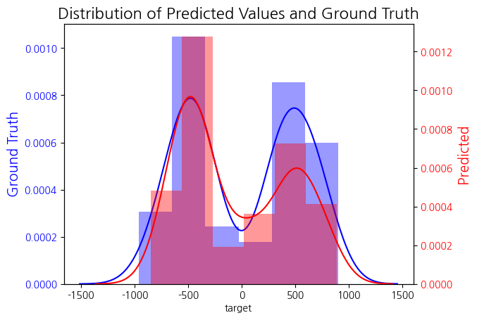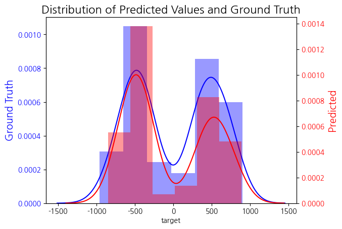 중심을 0, 확률 범위를 0.1로 했을 때 MAE 452, RMSE 645로 MAE는 한 개의 회귀모델보다 좋은 결과를 보였으며 예측값 분포 또한 실제와 비슷한 모습을 보였다.