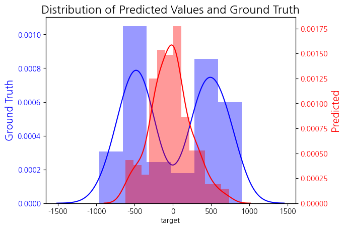 MAE=511, RMSE=569로 실제값은 두 개의 분포를 가지는데 반해 예측은 0 부근에서 대부분의 값을 가진다.