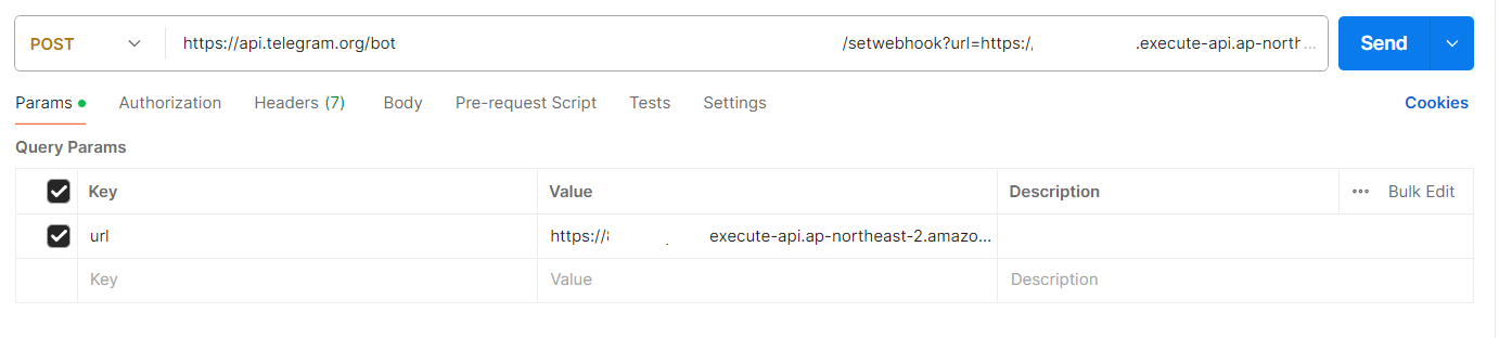 포스트맨 같은 데서 POST로 `https://api.telegram.org/bot{tokenid}/setwebhook`에 파라미터 url={api_gateway_url}을 추가하여 호출하자.
