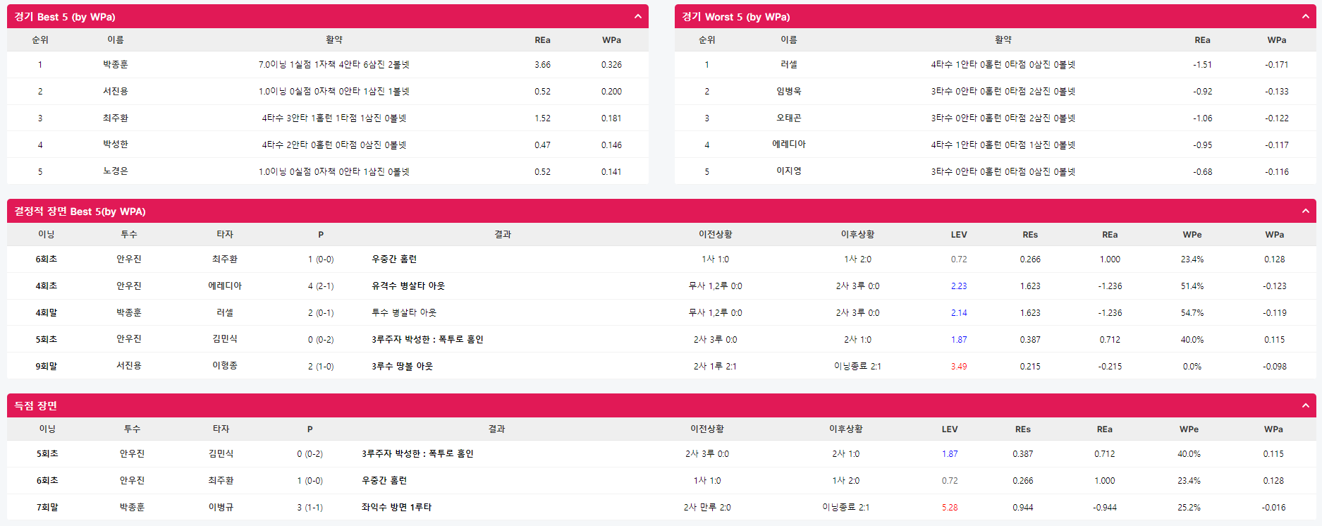 그리고 경기 요약 페이지로 가면 해당 경기의 best, worst, 득점장면을 확인할 수 있다.