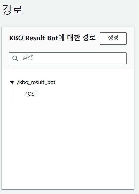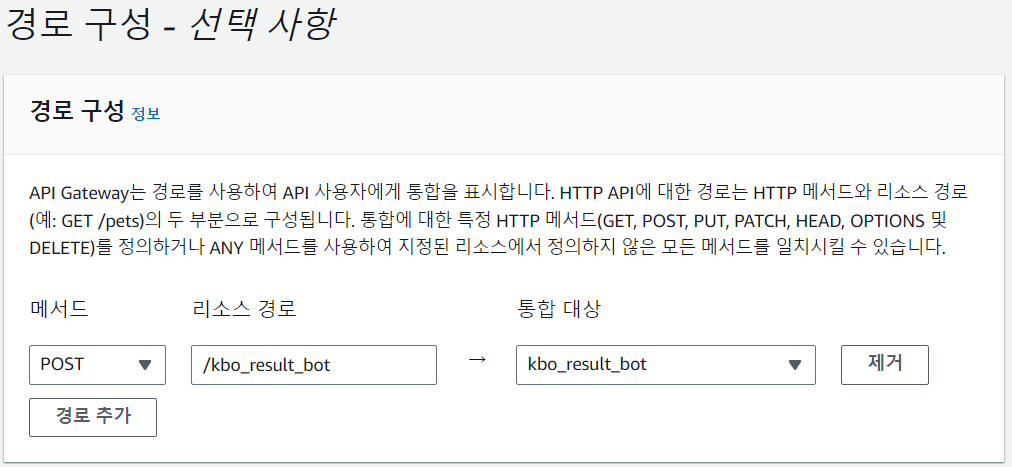 다음으로 넘어가 경로 구성에는 `ANY`를 `POST`로 바꿔주자. 리소스 경로는 본인 필요에 따라 변경해도 된다. 나중에 여기서 지정한 리소스 경로를 포함한 API를 호출할 것이다.