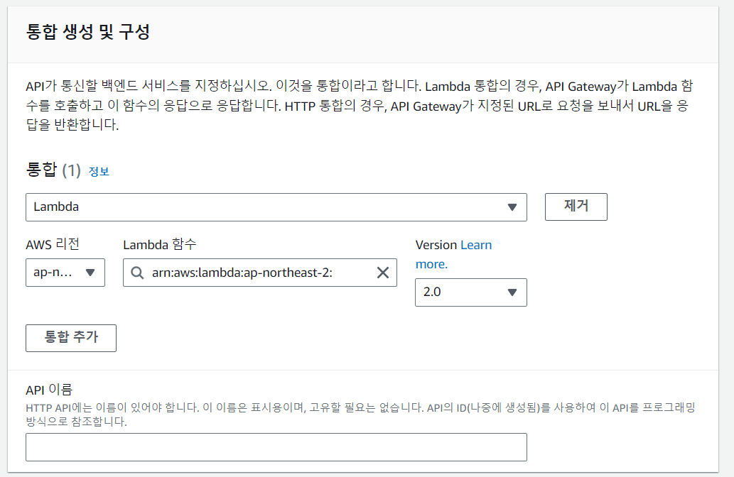 HTTP API 구축을 누르고 통합 추가를 하여 앞서 생성했던 Lambda 함수를 연결하자.
