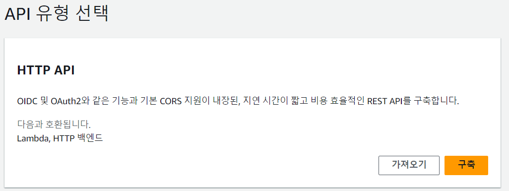 API Gateway에서 API 생성을 하자. 여러 유형의 API가 있지만 가장 간단한 HTTP API를 만들자.