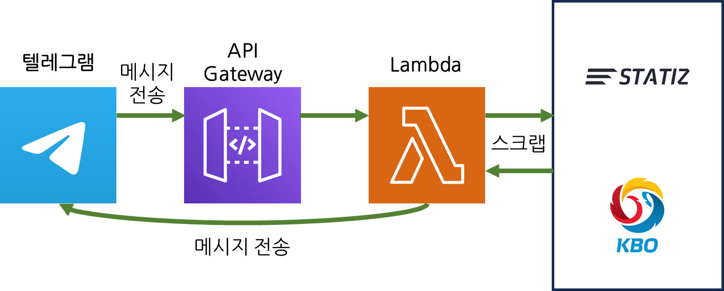 이전에 AWS Lambda와 텔레그램을 이용하여 날씨알림봇을 만들었다. 또 만들만한 봇이 뭐가 있을까 고민하다 평소 관심이 많은 야구와 관련된 봇을 만들고 싶어졌다. 제일 먼저 떠오른 건 실시간 경기 알림봇이었다. 내가 응원하는 팀이 앞서가는 득점 혹은 역전을 했거나 이겼을 때 나에게 알림을 주는 걸 생각했다. 하지만 몇 가지 현실적인 문제에 부딪혔다. 첫째로, 실시간으로 알림을 받는 서비스를 구축하는데 있어 Lambda 같은 서버리스 서비스보다 EC2처럼 24시간 돌아가는 서비스가 오히려 더 유리하다는 것이었다. 둘째로, KBO, 네이버, 다음 등 문자 중계를 해주는 제공처 모두 API가 없어 스크래핑을 해야하는데 이것도 만만치 않았다. 그래서 야구 관련한 다른 봇을 생각해봤을 때 과거 경기 기록을 검색하면 좋겠다는 생각을 해서 대화형 질답봇을 만드는 걸 목표로 했다.