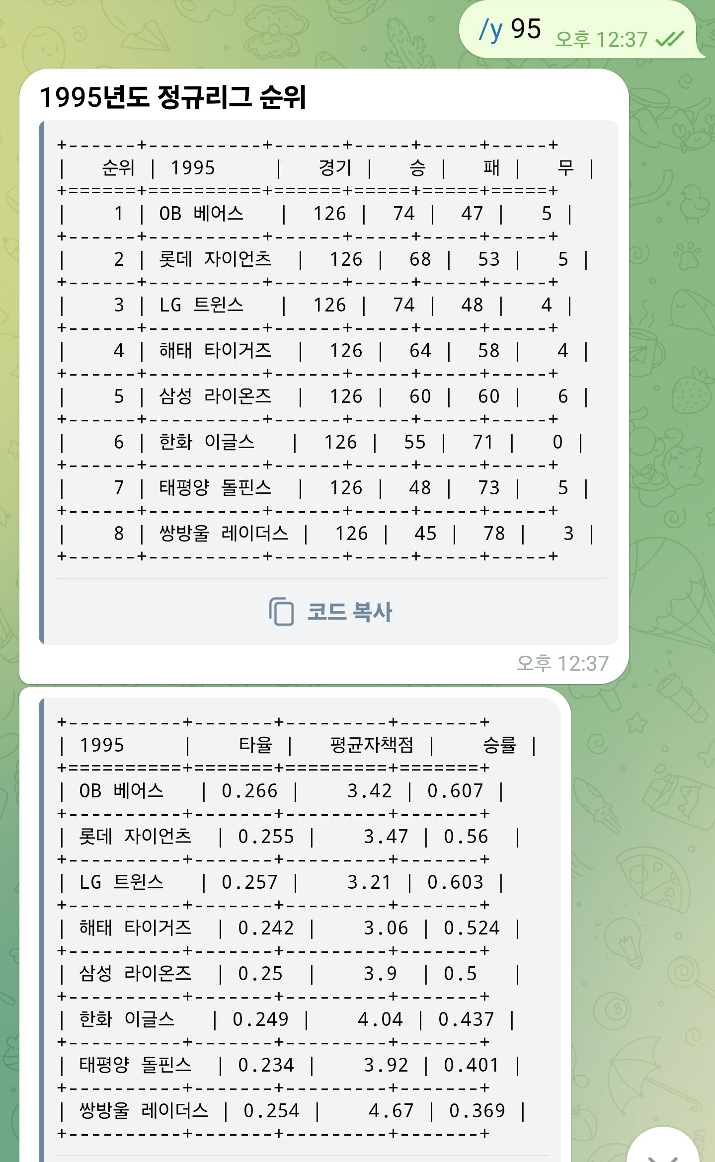 참고로 수집을 완료하면 테이블이 스탯티즈에서 보이는대로 가로로 길게 나오는데, 텔레그램에서는 테이블이 가로로 길면 모양이 깨지기 때문에 일부러 세로로 모양을 바꿨다.