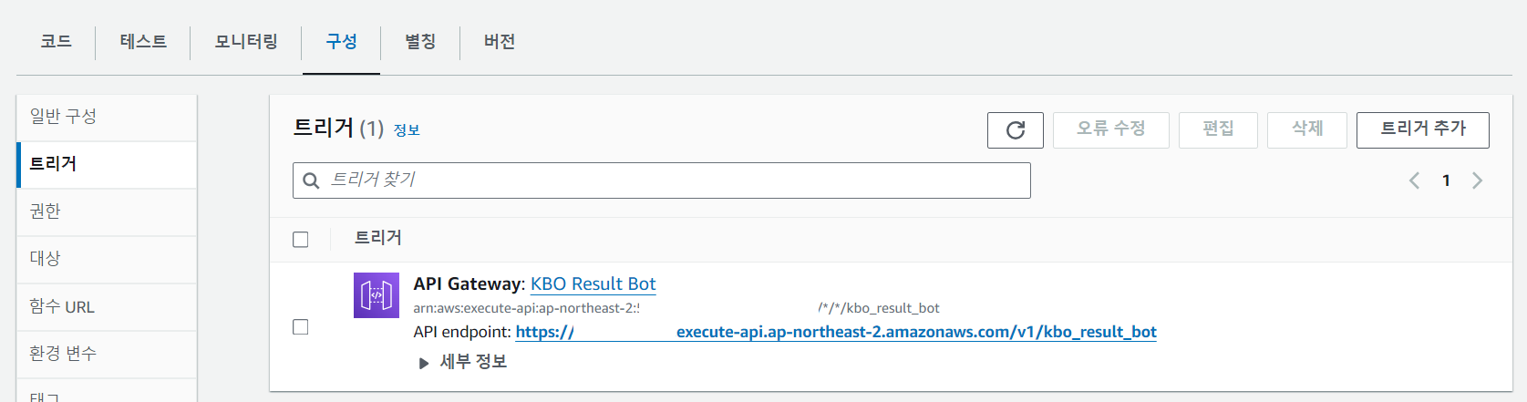 Lambda 함수 - 구성 - 트리거에서도 해당 API 주소를 확인할 수 있다.