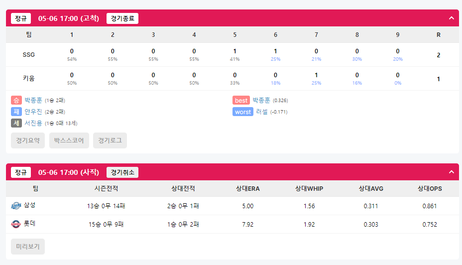 위처럼 각 파란색으로 칠해진 부분이 하나의 박스이다. 박스 내에 내가 찾고자 하는 팀이 있으면 그 박스를 계속 사용하도록 할 것이며, 만약 우천취소라면 더 이상 진행하지 않아도 된다.