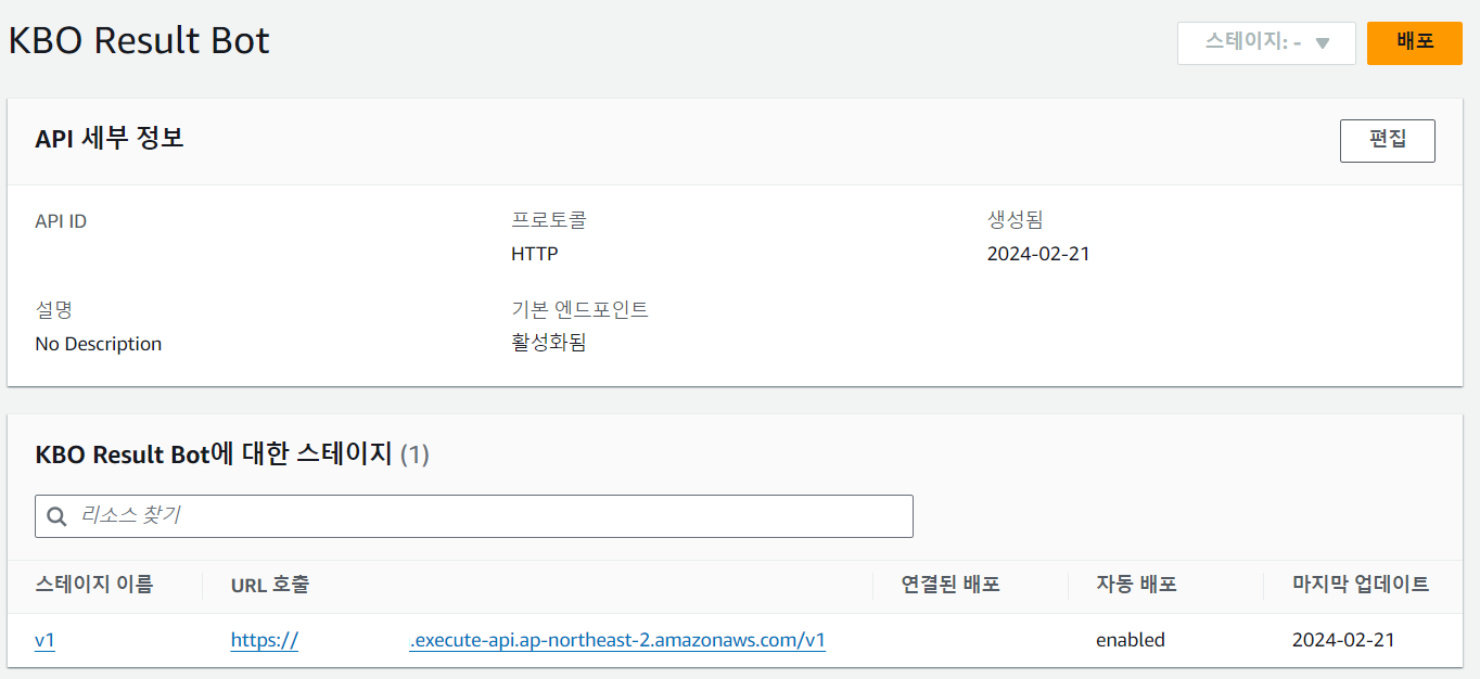 스테이지에 적혀있는 URL 맨 뒤에 리소스 경로를 붙인 `https://{apigateway_id}.execute-api.ap-northeast-2.amazonaws.com/v1/{리소스 경로}`가 API 주소가 된다.