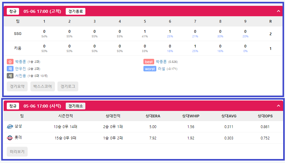 예를 들어 2023년 5월 6일인 경우 https://statiz.sporki.com/schedule/?m=daily&date=2023-05-06으로 이동하면 된다. 이 페이지에서 박스스코어와 승패세 결과도 바로 볼 수 있으며 우천취소 여부도 확인할 수 있다.