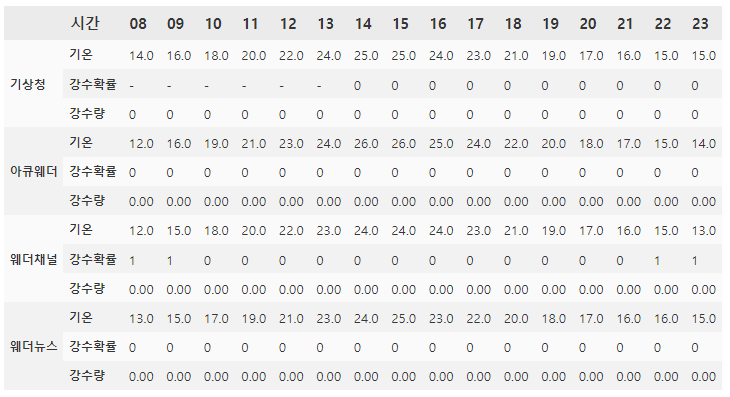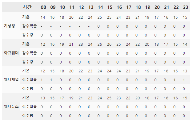 0. 배경 매일 아침 일어나면 오늘은 비가 올 것인지, 기온은 어떤지를 확인해본다. 그런데 이상하다. 제공사마다 강수확률과 기온이 다르다. 네이버에서는 제공사를 선택할 수 있도록 되어있지