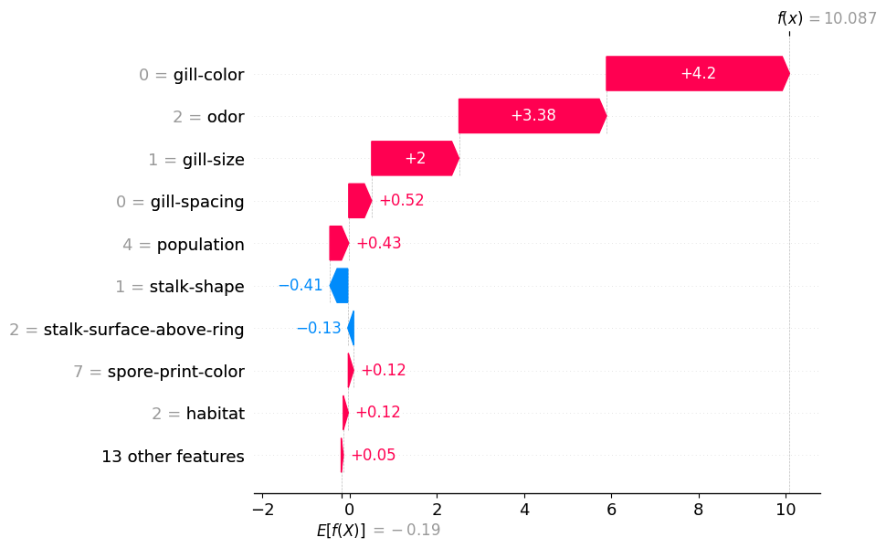 예를 들어, 모든 컬럼값이 명목형 변수인 버섯 데이터의 식용 여부를 예측하는 모델을 만들고 shap value를 계산했을 때 아래처럼 확인이 된다.