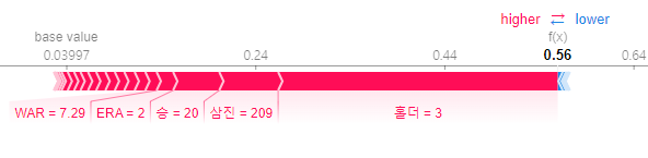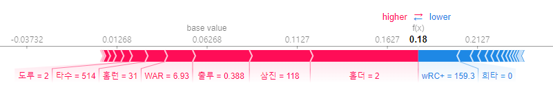 모델이 예측한 노시환의 확률은 18%였다. 18%까지 오르는데까지 기여한 이유로는 타이틀홀더가 2개, 피삼진이 118개 등으로 shapley value 계산 결과로 나타났다.